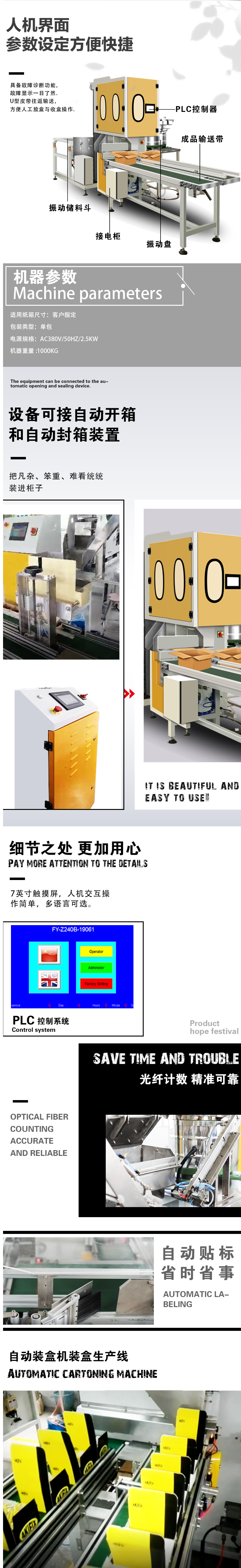 螺絲計數(shù)包裝機適用于單一產(chǎn)品包裝和2-3種混合產(chǎn)品包裝,采用PLC控制系統(tǒng),操作方便。可以提供自動下單、計數(shù)、包裝和打印。配備排氣裝置、打印機、貼標機、傳送帶和檢重秤,使其更加出色